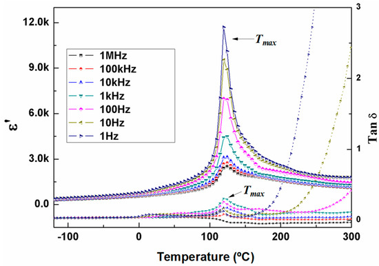 The temperature dependence of the dielectric constant (ε′) and the loss tangent (tanδ) at various frequencies for unpoled [111]-oriented plates.