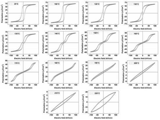 The polarization-electric field (P-E) hysteresis loops of a [111]-oriented PLN-0.07PT crystal platelet at various temperatures under a bipolar drive of E = ±100 kV/cm at 2 Hz is shown in Figure 7. It is found that the PLN-0.07PT crystal exhibits saturated single hysteresis loops at temperatures below 130 °C, which is the meaning of the FE state. With the increasing of temperature, the FE hysteresis loops are transformed into double hysteresis loops (some displayed as pinched hysteresis loops). The double hysteresis loops disappear between 170 °C and 180 °C, which is approximately 45 °C above the Curie temperature TC.