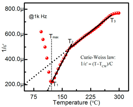 It is well-known that a dielectric constant with a sharp peak could fit the Curie–Weiss law (1/ε′ = (T − TCW)/C, where C is the Curie constant and TCW is the Curie–Weiss temperature) very well above the Curie temperature. Figure 8 shows the fitting of the Curie–Weiss law of PLN-0.07PT single crystals (1000 Hz). Interestingly, the two sections (T1 − T2, T2 − T3) of the reciprocal of the dielectric constant can be fitted with the Curie–Weiss law, respectively. The values of T1, T2, and T3 are about 125, 170, and 280 °C, respectively. The FE–PE phase transition exhibits a normal phase transition (T1 = Tmax = TC). It is reported that the polar regions (clusters) grow when approaching TC from the high-temperature side, reaching several lattice constants at the temperature TPR = 1.1* TC (K) [22,23]. For PLN-0.07PT single crystals, the value of TC is 398 K (125 °C). The temperature TPR is 437.8 K (1.1 × 398 K = 437.8 K). This value is close to the value of T2 (443 K). This points out that the polar region will induce anomalous behaviors in the temperature range from 443 K (170 °C), such as pinched hysteresis loops.