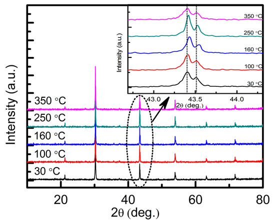 In order to confirm the structure phase transition of PLN-0.07PT single crystals, the temperature dependence of the structure was examined by XRD as shown in Figure 9. It can be seen that the peaks of (200)C (“C” refers to the cubic phase) reflections (shown in the inset of Figure 9) shift to a high angle (2θ) at 160 °C, indicating that a structure transition occurred between 100 °C and 160 °C, which corresponds to the FE–PE phase transition. Then, the 2θ shifts to a low angle with an increasing of temperature to 350 °C, which is induced by the disappearance of local non-centrosymmetric polar regions. Note that the symmetry of PLN-0.07PT single crystals at the PE phase is orthorhombic. Of course, the determination of the accurate temperature of a phase transition requires more work, such as the measurement of the loops accompanied by X-ray measurements in the field.