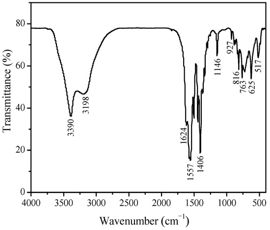 The FTIR spectra of the ligand and the complex [Zn2(btca)(H2O)4] are shown in Figure 3 and Figure 4. Compared with the infrared spectrum of the ligand, the number of infrared absorption bands of the complex is less, and this indicates that the symmetry of the complex is very good. In Figure 4, there is a wide and strong band near 3390 cm−1, which is assigned to the O–H bonds stretching vibration [17]. Compared with the ligand H4btca, the O–H stretching vibration absorption peak of the complex is wider, and the deformation vibration peak of the water molecules appears at 1624 cm−1 and there are absorption peaks near 930 cm−1 and 760 cm−1, which is an evidence for the existence of coordination water molecules [18]. The stretching vibration peak of the C–H bonds in the benzene ring is detected at 3198 cm−1. The absorption peaks at 1557 cm−1 and 1406 cm−1 are assigned to the asymmetric and symmetric stretching vibration in the carboxyl groups, respectively [19,20], and the bending vibration peak of the C=O bonds is located at 625 cm−1, all of which are a little lower than the frequency of H4btca (1673 cm−1, 1416 cm−1, and 658 cm−1). Hence, it is illustrated that the carboxyl oxygen atoms in H4btca coordinate with Zn(II) and then cause a redshift [21]. Additionally, the stretching vibration peak of Zn–O bonds detected at 517 cm−1 is evidence of the coordination between zinc and oxygen atoms [22].