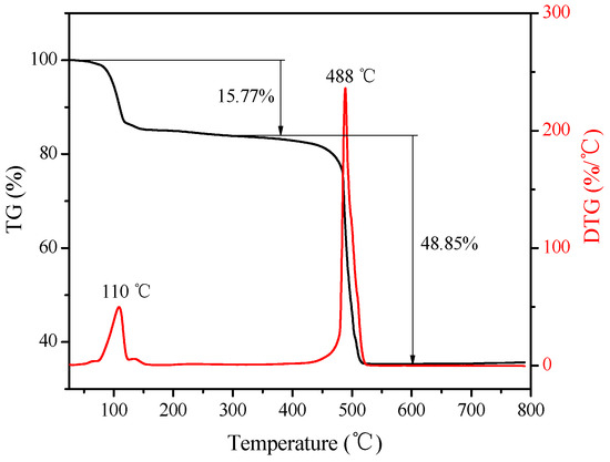 Studying thermal decomposition of complexes is helpful to understanding of coordination structure and mechanism of thermal decomposition [23]. The thermogravimetric and differential thermogravimetry (TG−DTG) curves of the complex are shown in Figure 5. The TG analysis reveals that the complex is decomposed through two major processes, namely the loss of coordinated water molecules and the oxidative decomposition of the ligand btca4− anion. The first weight loss is approximately 15.77% (calcd. 15.91%) near 110 °C, corresponding to loss of four coordination water molecules. The second weight loss occurred at 488 °C is 48.85%, and the final residue is zinc oxide (Found 35.38%, calcd. 35.93%). The decomposition processes can be expressed by the Equation (1) as follows: