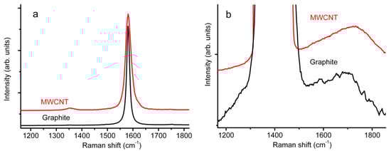The Raman spectra of the initial graphite and MWCNT samples are characterized by a G-band at 1581 cm−1. A disorder-induced D-band in fact is absent in both samples (Figure 1a). The graphite or MWCNT samples were loaded into a shear diamond anvil cell (SDAC), and their Raman spectra (Figure 1b) were studied in situ.