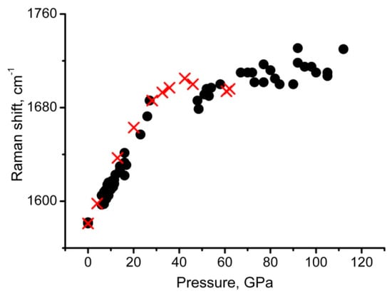 Pressure dependences of the Raman G-band of graphite and MWCNT (Figure 2) are quite similar. Both dependences are linear below 25–30 GPa. With further increase in pressure, both dependences display the instability of sp2-bonding [18] at a pressure above 30 GPa. Slowing in the change of Raman frequency indicates that the graphite and MWCNT structures become unstable at pressures above 30–35 GPa.