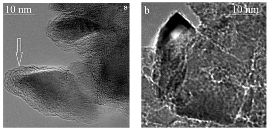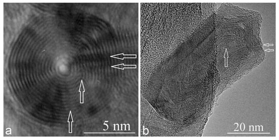 Onions formed from different precursors. (a) An onion obtained from graphite at 70 GPa. The arrows denote linear and point defects. There is a splitting of some graphene layers in multi-layered onions. According to [20,21] in the places of splits, the atoms of adjacent layers join and form sp3-bonds; (b) An onion obtained from MWCNT. The horizontal arrows indicate the radial disorders (linear defects) responsible for the formation of sp3-bonds, the vertical arrow points to the fragments of nanotubes inside the onion.