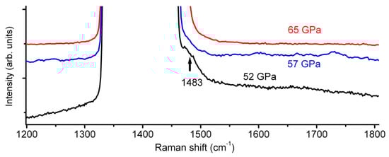 The mixture of 25 nm nanodiamond and 25 wt % of NaCl as a pressure-transmitting media was placed in the gasket hole. The Raman band of the diamond loaded in a NaCl medium to 52 GPa is located at 1483 cm−1, which is appropriate to the known data [22]. The Raman band of diamond shifts from 1333 cm−1 to 1483 cm−1 under a 52 GPa pressure. The stress tensor conditions in the diamond sample differ from the ones in the diamond anvils, so the Raman band of the diamond loaded between the anvils is separated from the Raman band of the diamond anvil [22]. An increase in pressure from 52 GPa to 57 GPa leads to the disappearance of the diamond Raman band (Figure 4) under the influence of laser radiation (the Raman spectra were registered when excited by a 1 mW laser beam with a 532 nm wavelength focused to a 1–2 μm spot). The G-band does not appear in the spectra (according to Figure 2, one could be expected around 1700 cm−1 at pressure ~60 GPa). Under ambient conditions, the same irradiation does not lead to degradation of diamond powder with a 25 nm grain size.