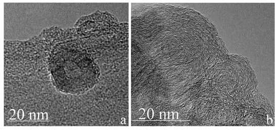 The diamonds irradiated at a pressure of 120 GPa are preserved without any noticeable changes in the phase composition. The diamonds irradiated at 57, 60, and 70 GPa are transformed into onions. Figure 5 depicts two types of onions created from diamond under 57 and 60 GPa, and the onion-like structures with nuclei of 5 nm nanodiamonds in the center obtained under laser radiation at a 70 GPa pressure (Figure 6a). The latter structure could be also considered as 5 nm nanodiamonds covered by a few graphitized layers of carbon created from a 25 nm nanodiamond. Nevertheless, comparison of Figure 5 and Figure 6 prompts consideration of the structures presented in Figure 6a as onion-like structures with nuclei of 5 nm nanodiamonds in the center. The images of the initial 25 nm diamonds are provided for comparison (Figure 6b). No graphitized layers of carbon can be seen on the surface of the initial diamonds.