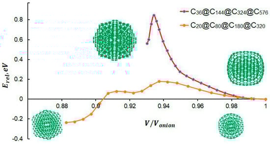 Figure 7 shows the energy dependence on the volume of intermediate structures during the onion–nanodiamond transition. We observe that the behavior of the two nanostructures under investigation is fundamentally different. In particular, the onions containing the chemically active C20 fullerene in their center (orange curve) tend to retain the energy-favorable sp3-hybridized interlayer bonds. Consequently, these onions remain in a compressed state even after unloading. This is due to the fact that such a sequence of fullerene shells is obtained with a ~2.5 Å distance between the layers, which is much less than the interlayer distance in graphite (3.4 Å). While in the structure containing some interlayer sp3-bonds their lengths are ~1.6 Å, with an increase in the number of layers this value tends more and more toward the characteristic bond length in cubic diamond (1.54 Å). The appearance of a local minimum of the dependence near 0.92 V/Vonion in the figure is explained by the fact that the fourth layer of the transition structure at this point is already at a distance significantly exceeding the characteristic length of the carbon sp3-bond, while the three-layer nucleus still contains some interlayer bonds.