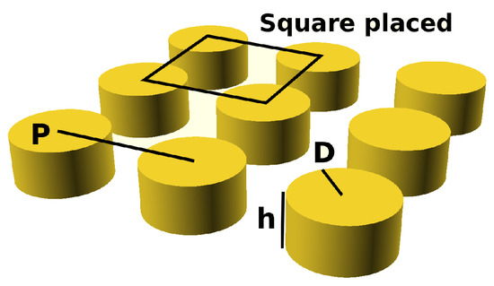 Table 1, for the unwrapped configuration without any optical coupling. Two different geometrical shapes were investigated: a pillar of P = 640 nm, D = 500 nm, and round holes of P = 280–450 nm, D = 170–220 nm. The height is fixed in both cases by the
