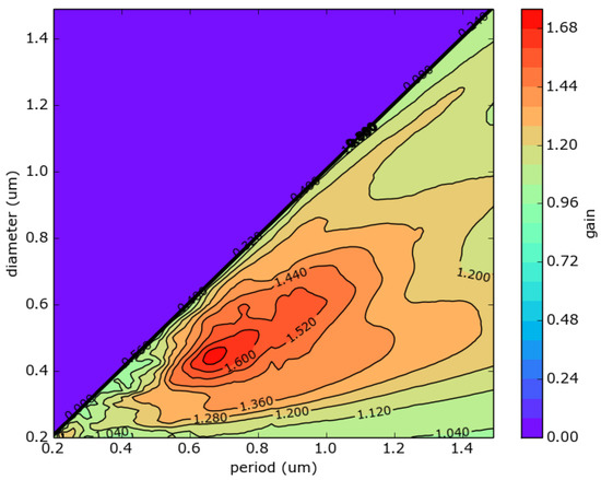 Figure 22). Notice that for the lower refractive index, the optimal periodicity is shifted to higher values (up to 1.7 µm).
