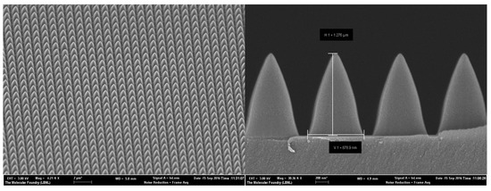 3, and the pattern was made using a nano-imprinting UV curing procedure. This technique required the production of a custom polymer, capable of being cured and hardened as a result of the UV light illumination, to be transparent to the LYSO light and with the highest RI possible. With this purpose, a curable polymer was produced. The polymer has an RI = 1.825 at 400 nm and shows good transparency in the LYSO emission region. The pyramidal layout of the pattern is show in