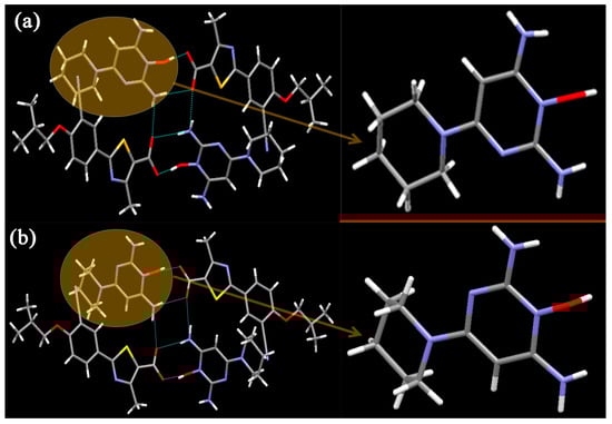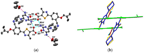 FEB-MIN·ACE and FEB-MIN·THF are isostructural salt solvates, and both crystallize in the triclinic P-1 space group with a 1:1:1 stoichiometry. The isostructural FEB-MIN·ACE and FEB-MIN·THF have the same basic structural motif, in which one proton from the carboxylic group of FEB transfers to the imino N5 atom of MIN. In the compounds of FEB-MIN·ACE and FEB-MIN·THF, two FEB anions and two MIN cations form a tetrameric (9) (8) (9) graph set through O4-H4···O2, N5-H5A···O1i and N5-H5B···O1 hydrogen bonds (Figure 1a). Meanwhile, two solvent molecules are centrosymmetrically tethered to protonated MIN molecules by weak N-HMIN···OACE/THF hydrogen bond interactions in FEB-MIN·ACE and FEB-MIN·THF, respectively. The imino C19-N5 and amino C17-N3 are nearly equal within error (1.316 vs. 1.332 Å for FEB-MIN·ACE, 1.323 vs. 1.345 Å for FEB-MIN·THF) due to the conjugate interaction. The dihedral angles of thiazole and phenyl rings are 2.4° and 3.1° in FEB-MIN·ACE and FEB-MIN·THF, respectively, which suggests the coplanarity as shown in Figure 1b. The dihedral angles of the solvent and FEB molecule in FEB-MIN·ACE and FEB-MIN·THF are 65.8° and 57.0°, respectively.