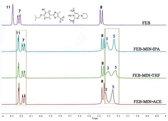 The samples of FEB, FEB-MIN·ACE, FEB-MIN·THF and FEB-MIN·IPA were dissolved in DMSO-d6 solvent, respectively. A comparative analysis of 1H-NMR spectra was shown in Figure 4. There were two protons at N5 for three salt solvates, which were attributed to one proton of FEB transferring to the N5 atom of MIN. The three salt solvates showed different peak shifts of protons at N3 and N5 atoms, which were mainly attributed to the hydrogen bonding interaction. Due to the anisotropy shielding effect of chemical bonds, the characteristic peaks of protons at C11, C7, and C8 atoms of three salt solvates showed apparent chemical shifts compared with that of FEB.