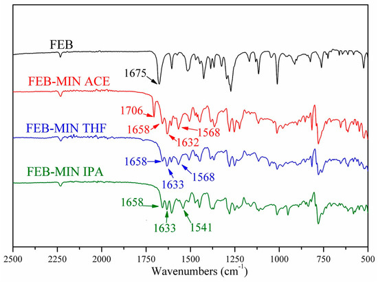 Comparative IR spectra for FEB, FEB-MIN·ACE, FEB-MIN·THF and FEB-MIN·IPA are shown in Figure 5. Characteristic peak at 1675 cm−1 of FEB is attributed to C=O stretching frequency, which shifts to 1658 cm−1 due to the deprotonation of carboxylic group. The stretching frequency of C=N of MIN molecule in three salt solvates occurs at 1632 cm−1, 1633 cm−1 and 1633 cm−1, respectively. Characteristic peaks at 1568 cm−1 of FEB-MIN·ACE and FEB-MIN·THF are attributed to C=C stretching frequency of MIN molecules [26]. Compared FEB-MIN·IPA with FEB-MIN·ACE and FEB-MIN·THF, the peak of C=C stretching frequency shifts from 1568 to 1541 cm−1. This phenomenon is mainly attributable to the different arrangement of MIN molecules. A characteristic peak at 1706 cm−1 of FEB-MIN·ACE salt is attributed to C=O which belongs to acetone molecules.