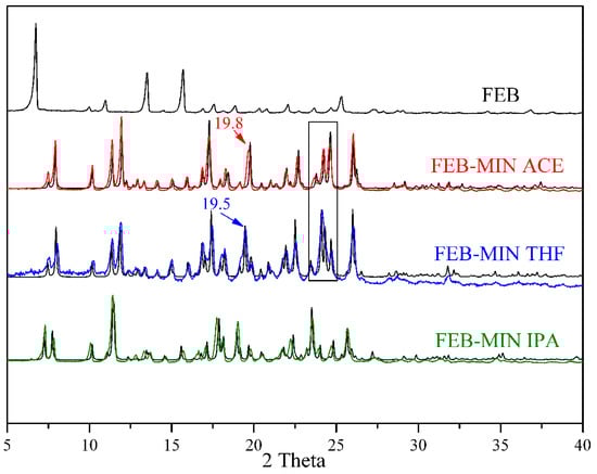 The following are available online at http://www.mdpi.com/2073-4352/8/2/85/s1, Table S1: The detailed PXRD values of FEB-MIN·ACE, Table S2: The detailed PXRD values of FEB-MIN·THF, Table S3: The detailed PXRD values of FEB-MIN·IPA, Figure S1: 1H-NMR spectra of FEB-MIN·ACE in IPA solution after 24 h, Figure S2: 1H-NMR spectra of FEB-MIN·ACE in THF solution after 24 h, Figure S3: 1H-NMR spectra of FEB-MIN·IPA in ACE solution after 24 h, Figure S4: 1H-NMR spectra of FEB-MIN·IPA in THF solution after 24 h, Figure S5: 1H-NMR spectra of FEB-MIN·THF in ACE solution after 24 h, Figure S6: 1H-NMR spectra of FEB-MIN·THF in IPA solution after 24 h, Figure S7: 1H-NMR spectra of FEB-MIN·ACE in mixed solution after 24 h, Figure S8: 1H-NMR spectra of FEB-MIN·THF in mixed solution after 24 h, Figure S9: 1H-NMR spectra of FEB-MIN·IPA in mixed solution after 24 h, Figure S10: 1H-NMR spectra of FEB-MIN·ACE in mixed solution after 48 h, Figure S11: 1H-NMR spectra of FEB-MIN·IPA in mixed solution after 48 h, Figure S12: 1H-NMR spectra of FEB-MIN·THF in mixed solution after 48 h, Figure S13: 1H-NMR spectra of FEB-MIN·ACE, Figure S14: 1H-NMR spectra of FEB-MIN·THF, Figure S15: 1H-NMR spectra of FEB-MIN·IPA.