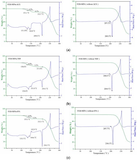 The stoichiometry of solvates is also determined by measuring the mass loss when heating in certain temperature ranges using a thermal gravimetric analyzer. All three salt solvates show two successive desolvation process with mass loss (w/w) of 10.3% (10.0% theoretically) for FEB-MIN·ACE, 12.4% (12.1% theoretically) for FEB-MIN·THF and 10.1% (10.3% theoretically) for FEB-MIN·IPA.