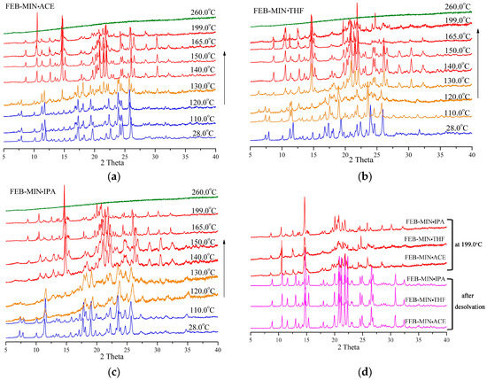 Variable temperature powder x-ray diffraction (VT-PXRD) measurements showing phase transformations, (a) FEB-MIN·ACE, (b) FEB-MIN·THF, and (c) FEB-MIN·IPA, (d) PXRD patterns at 199 °C and after desolvation.