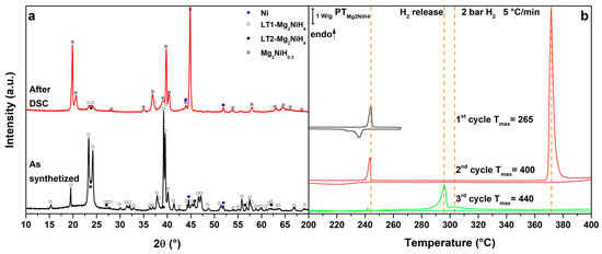 The PXD pattern after the DSC analysis (Figure 2a, after DSC) confirms the total decomposition of LiBH4 and Mg2NiH4. In fact, MgNi2.5B2, MgH2 and a small quantity of unreacted Mg are observed but no Li-containing phases are evidenced, likely because of the light scattering factor. LiBH4 cannot be reformed because of the low hydrogen pressure applied. The obtained results are in good agreement with the literature [27] and confirms the decrease of the decomposition temperature of both Mg2NiH4 and LiBH4 when mixed together into a RHC.