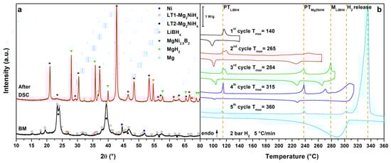 Figure 2b shows the DSC signals for the RHC mixture MgNiLi upon cycling. In the 1st cycle (Figure 2b, 1st cycle), the polymorphic transition of LiBH4 is identified Tpeak = 117 °C, which is reversible upon cooling. In the 2nd cycle (Figure 2b, 2nd cycle), after the polymorphic transition of LiBH4, also the polymorphic phase transition of Mg2NiH4 is observed as a broad peak around 245 °C. Both DSC signals can be observed also on cooling. Furthermore, in the 3rd cycle (Figure 2b, 3rd cycle), after the polymorphic transition peaks, the melting of LiBH4 can be detected at Tpeak = 279 °C. All transitions are reversible and well visible during the cooling process and temperature values are in good agreement with the literature [3,4,35]. In the 4th cycle (Figure 2b, 4th cycle), after the polymorphic transition peaks and LiBH4 melting, at Tpeak = 308 °C a broad endothermic peak due to hydrogen release from LiBH4 can be observed under 2.7 bar H2. In this case, on cooling, only small peaks from the polymorphic transitions can be observed, suggesting the occurrence of a reaction. In fact, in the last cycle (Figure 2b, 5th cycle) only small DSC peaks of Mg2NiH4 polymorphic transition, LiBH4 polymorphic transition and melting can be observed on heating, evidencing the presence of a small quantity of parent hydrides in the sample. At higher temperatures, at Tpeak = 335 °C, the main hydrogen release from the RHC mixture can be observed, with LiBH4 and Mg2NiH4 forming MgNi2.5B2 and Mg. Upon cooling below 307 °C, Mg absorbs hydrogen to form MgH2.