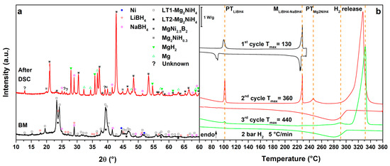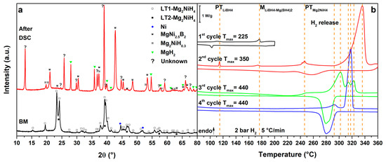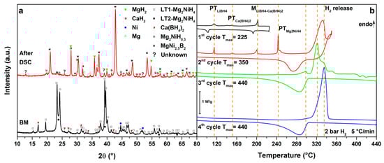 Mg2NiH0.3, MgH2 and MgNi2.5B2 are present in the PXD pattern after DSC (Figure 3a, after DSC), together with an unknown phase. The XRD peak positions of this unknown phase correspond to those observed after decomposition of the Mg2NiH4-Ca(BH4)2 system [30]. The presence of KBH4 in the mixture suggests that not all the borohydride present in the mixture has been decomposed upon thermal cycling. Therefore, from the liquid eutectic mixture of borohydrides, only LiBH4 actively reacts with Mg2NiH4, whereas the most stable KBH4 remains unaffected.