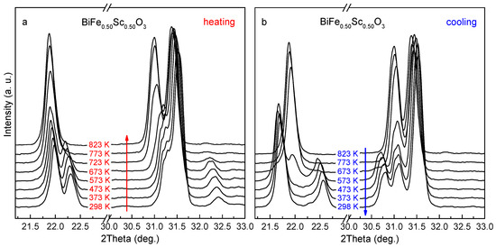 The most representative ranges of the XRD patterns of the as-prepared BiFe0.50Sc0.50O3 perovskite at the first thermal cycle: (a) on heating up to 873 K and (b) on cooling down to room temperature.