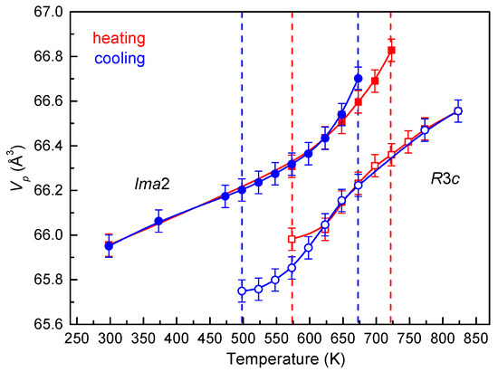 The second and all of the following heating/cooling thermal cycles, with maximum temperature not exceeding 920 K, demonstrated that the transition between the Ima2 phase and the R3c phase in BiFe0.50Sc0.50O3 is reversible. The R3c phase appears at about 570 K and disappears at 500 K, while the orthorhombic Ima2 phase disappears at about 720 K and appears again at about 670 K (Figure 2).