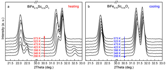 In the XRD patterns of the in situ studied BiFe0.70Sc0.30O3 ceramics, regular changes in both the shape and the intensity ratio of the fundamental reflections, suggesting an onset of an R3c phase, were observed to appear between 380 K and 400 K (Figure 3a). The transformation was complete at about 470 K: no traces of the parent Pnma phase were observed above this temperature. The transformation was irreversible since the rhombohedral symmetry of the annealed BiFe0.70Sc0.30O3 sample remains when the sample is cooled down to room temperature (Figure 3b).