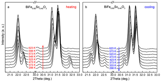 The most representative ranges of the XRD patterns of the as-prepared BiFe0.70Sc0.30O3 perovskite at the first thermal cycle: (a) upon heating to 923 K and (b) upon cooling to room temperature.