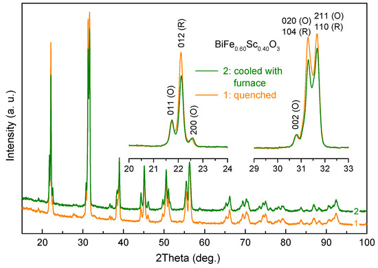 XRD patterns of the BiFe0.60Sc0.40O3 perovskite at room temperature after 4-h of annealing at 873 K followed by either quenching or slow cooling with a furnace. The cooling rate was ≤ 1 K/min. The insets show the most representative ranges of the XRD patterns, with the diffraction reflections of the rhombohedral R3c phase (R) and the orthorhombic Ima2 phase (O) indicated.