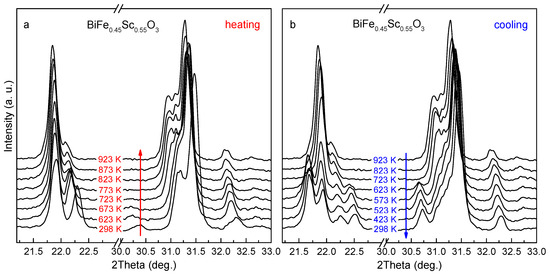 The most representative ranges of the XRD patterns of the as-prepared BiFe0.45Sc0.55O3 perovskite at the first thermal cycle: (a) upon heating to 923 K and (b) upon cooling to room temperature.