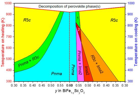 Based on the data of the in situ temperature XRD study, a tentative state diagram of the BiFe1−yScyO3 series in the range of 0.30 ≤ y ≤ 0.60, where the as-prepared phase is the antipolar orthorhombic phase, was suggested (Figure 7). The right part of the diagram indicates the irreversible Pnma-to-R3c transitions (both complete and incomplete), while the transitions shown in the left part are all reversible.