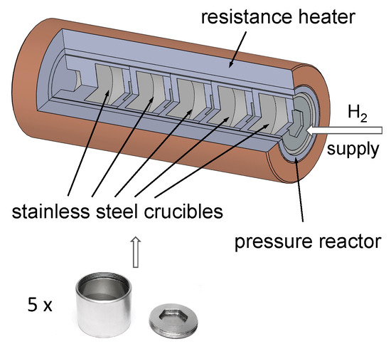 - Polanski, M.; Witek, K.; Nielsen, T.K.; Jaroszewicz, L.; Bystrzycki, J. The influence of the milling time on the yield of Mg2FeH6 from a two-step synthesis conducted in a custom-made reactor. Int. J. Hydrog. Energy 2013, 38, 2785–2789. [Google Scholar] [CrossRef]