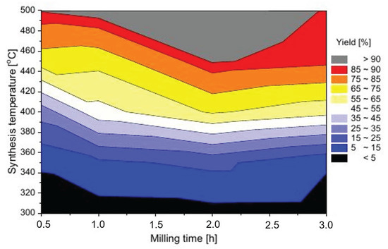 - Increasing the milling time of the powders up to a certain length improves the process yield. For the experimental setup used, the highest reaction yield was found with a milling time of 2 h.