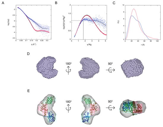 Analysis of the one-dimensional SAXS experimental curves was initially performed to judge the quality of the data and obtain basic structural information related to the size and shape of the studied proteins (Figure 3A). One such structural parameter is the radius of gyration (Rg), which is calculated from the slope of the Guinier plot described as ln(Iq) vs. q2, in which q = 4πsin(θ/λ) is the scattering vector (2θ is the scattering angle and λ is the wavelength) [36]. For globular proteins, this plot is expected to be linear at low q, corresponding to values of q × Rg < 1.3 in the Guinier zone of 0–1/Rg. Linearity of the Guinier plot is considered a quality measurement of the data, but does not ensure ideality of the sample. SAXS curve analysis also provides an estimate on the molecular mass of a protein that in turn relates to its oligomeric state. The molecular mass of a protein approximately corresponds to half of its Porod volume (excluded volume of the hydrated protein particle). Porod analysis reflects the behavior of the scattering intensity at higher q range (Porod plot). Finally, the maximum size of a protein (Dmax) can be obtained from analysis of SAXS data by means of the Pair-Distance Distribution Function [P(r)], which corresponds to the distribution of distances between all the electrons within the protein. The pair-distance distribution function is obtained using the Indirect Fourier Transformation (Glatter et al. [37]) with a trial and error procedure, at the end of which the obtained Dmax corresponds to the smoothest and positive distribution. Differences in the Dmax of a protein relate to conformational changes. Additionally, it is possible to calculate the Rg from the Pair-Distance Distribution Function and to compare its value with that estimated from the Guinier plot.