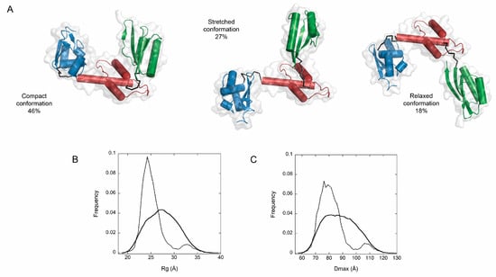 A low-resolution model of the protein can be reconstructed from the SAXS data using ab-initio algorithms such as DAMMIN [38], DAMMIF [39], MONSA [38], or by hybrid modeling using known atomic structures of domains with SASRES [40]. The ab-initio methods represent the particle as finite volume elements (or dummy atoms) and employ a simulated annealing to fit the experimental data. We used DAMMIF in combination with the DAMAVER program [41] to model the Bcp1 and AfSBDS proteins. The unicity of the SAXS models was calculated with AMBIMETER whose values of 0.0 and 2.9 for Bcp1 and AfSBDS, respectively, suggested a potentially unique model for Bcp1 and a highly ambiguous three-dimensional reconstruction for AfSBDS. Subsequently, we used DAMMIF to generate ten “dummy atoms” models, which were averaged with DAMAVER using the default mode. The models selected for averaging had a Normalized Spatial Discrepancy (NSD) value of 0.571 and a standard deviation (SD) of 0.022. Models with values larger than <NSD> + 2*SD were discarded. The calculated SAXS curves for the models were compared to the experimental ones, and good agreement was validated by the chi square values (χ2) between 2.08–2.67 for Bcp1 and 1.25–1.26 for AfSBDS. The averaged model obtained for Bcp1 (Figure 3D) confirmed the approximate globular structure predicted from the P(r) function. The correctness of the AfSBDS model obtained from the SAXS data was, at this point, also confirmed using the crystallographic model. Figure 3E shows the fitting of the latter into the SAXS envelope. For flexible macromolecules, specialized programs exist, designed to deal with ensemble-averaged data, like EOM 2.0 (Ensemble Optimization Method) [4,42]. This program assumes the coexistence of different conformations in solution for which the average scattering intensity fits the experimental SAXS curves. To this end, we used EOM to investigate the different conformations of AfSBDS. The protein was divided into its three domains according to the crystallographic structure; the inter-domain linkers were removed, and domain 2 was fixed, while the other two were left free to move randomly and cover the entire conformational space. A pool of 10,000 independent random coil models was initially generated. The theoretical scattering curve was automatically computed for each model in the pool by CRYSOL [43]. A genetic algorithm was used to select ensembles ranging from 2 to 50 conformers of different sizes. Their average theoretical profiles were calculated and fitted to the experimental SAXS data. The process was repeated 100 times, and the ensemble with the lowest discrepancy was reported as the best solution out of 100 final ensembles. This analysis revealed that in solution the final ensemble (averaged model) has an Rg of 25.73 Å, which is in good agreement with that of the crystal structure (25.65 Å). AfSBDS mainly populates three conformations: 46% exists in a “compact conformation” with a Rg of 22.75 Å and a Dmax of 69.36 Å, a second “stretched conformation” with 25.96 Å and 80.11 Å, respectively, and 27% abundance, and a third “relaxed conformation” with Rg = 26.79 Å and Dmax = 86.11 Å and 18% abundance. A population in a completely extended conformation (≈180°) was also found in 9% of the cases, with Rg = 35.27 Å and Dmax = 112.73. Figure 4 shows the three main conformations and the Rg and Dmax distribution of the initially generated population, and that selected at the end of the process. This distribution confirmed that AfSBDS is not a fully flexible molecule but a molecule with limited movement. The numerical parameter of Rflex for the ensemble corresponded to 78%, compared to the 89% value for the pool, suggesting that the former is less flexible (a value of 100% denotes a fully flexible system and 0% a fully rigid one). Additionally, the Rsigma parameter of 0.83 supported the hypothesis that the system is flexible (Rsigma values lower than 1 refer to systems with a high degree of flexibility).