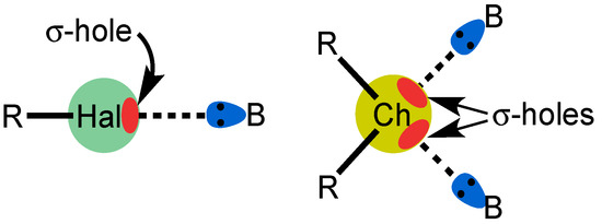 Nowadays, one of the vigorously investigating types of such interactions is chalcogen bonding (CB). CB is usually defined as non-covalent interactions between localized positive regions on a chalcogen atom in the extension of the covalent bonds (σ-holes) and electron donor species serving as CB acceptors [11,12,13,14,15,46,47,48,49,50]. Unlike halogens a chalcogen atom possess two σ-holes at the same time and is prone to the formation of bifurcated chalcogen bonding (BCB) (Figure 1) [51,52,53,54,55,56,57].