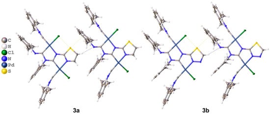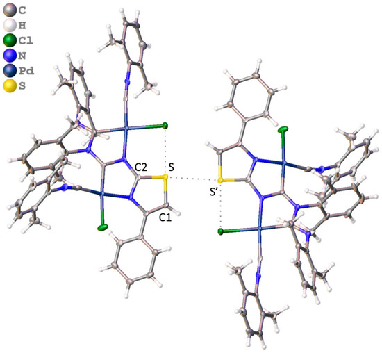 The sulfur atom in 3c possesses one intramolecular CB with the PdII-bound chloride (as in the previous cases) and one intermolecular CB with the symmetrically located S atom in the neighboring molecule (Type I [96]; Figure 4). In contrast to 3a,b steric hindrance of the bulky phenyl substituent in the 4th position of the thiazole ring prevents formation of S•••πXyl CB and leads to the formation of different intermolecular CB. The intermolecular S•••S CB connects two symmetrically located molecules of 3c providing the dimeric structure in the solid state. The distances between the S and the Cl (3.1419(18) Å) and between two S atoms (3.459(2) Å) are less than the sum of their Rowland’s [92] or even Bondi’s [85] vdW radii (S•••S 3.62 and 3.60 Å). The corresponding angle C1–S•••Cl is 177.65(17) being appropriate for the classic CB (Type II) [93,94], whereas C2–S•••S’ angle is 153.99(16) in the case of both symmetrically located molecules of 3c revealing that it is Type I interaction [96]. The S•••Cl/S•••S BCB in 3c were theoretically studied by AIM analysis (see Section 3.3.2), and estimated energies of these non-covalent contacts are 2.7–2.8 (S•••Cl) and 0.9–1.3 (S•••S) kcal/mol.