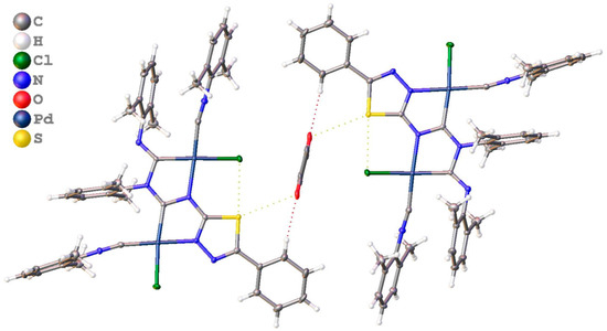 Additionally, there is the contact between the C atom of the C=O group in acetone and the Pd-bound chloride (Figure 6). The distances between the C and Cl atoms (3.307(7) Å) are substantially less than the sums of Rowland’s [92], or even Bondi’s [85], vdW radii (3.53 and 3.45 Å). In this case the acyl C atom should acts as an electron density acceptor due to the π-hole on it [32,98,99,100], whereas the lone pair of the chloride ligand is an electron density donor.