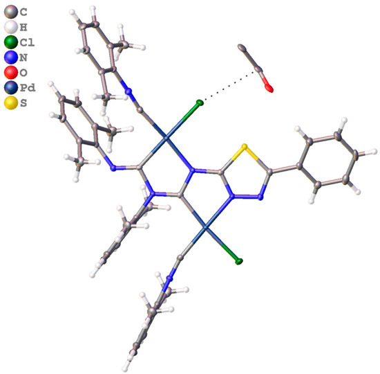 Solvents, PdCl2, 4-phenyl-1,3-thiazol-2-amine, and xylyl isocyanide were obtained from commercial sources and used as received. Complex cis-[PdCl2(CNXyl)2] was synthesized by the literature procedure [58]. Mass-spectra were obtained on a Bruker micrOTOF spectrometer (Billerica, Massachusetts, MA, USA) equipped with electrospray ionization (ESI) source; a mixture of MeOH and CH2Cl2 was used for samples dissolution. The instrument was operated at a positive ion mode using m/z range of 50–3000. The capillary voltage of the ion source was set at −4500 V and the capillary exit at 50–150 V. The nebulizer gas pressure was 0.4 bar and the drying gas flow 4.0 L/min. All NMR spectra were acquired on a Bruker Avance 400 spectrometer (Billerica, Massachusetts, MA, USA) in CDCl3 at ambient temperature.