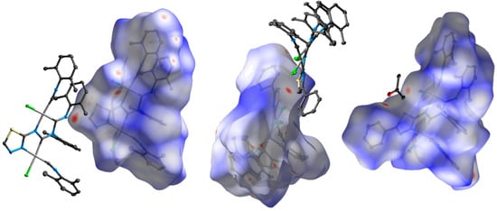 Hirshfeld surfaces for 3b (left), dimer of 3c (middle), solvate of 3d with acetone (right). Thermal ellipsoids are drawn at the 50% probability level; all of the hydrogen atoms are omitted for clarity.