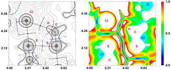 Contour line diagram of the Laplacian distribution ∇2ρ(r), bond paths and selected zero-flux surfaces (left) and RDG isosurface (right) referring to the intra-/intermolecular bifurcated chalcogen bonding S•••Cl/S•••S in model dimeric associate 3c. Bond critical points are shown in blue, nuclear critical points– in pale brown, ring critical points—in orange. Length units—Å, RDG isosurface values are given in Hartree.