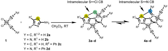 In the continuation of our projects focused on metal-mediated reactions of isocyanides [15,58,59,60,61,62,63,64,65,66,67,68] and on non-covalent interactions [15,58,69,70,71,72,73,74,75,76,77], we recently reported on the coupling between cis-[PdCl2(CNXyl)2] (Xyl = 2,6-Me2C6H4) and various thiazol- and thiadiazol-2-amines that leads to a mixture of two regioisomeric binuclear diaminocarbene complexes corresponding to kinetically (3a–d) or thermodynamically (4a–d) controlled regioisomers (Scheme 1). There is an equilibrium between these two species in CHCl3 solutions that depends on the energy difference between two types of intramolecular CBs, viz. S•••Cl and S•••N [58].