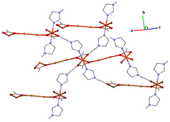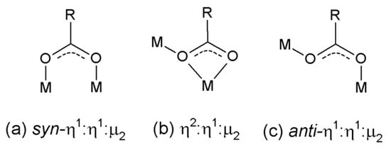 Coordination polymers and metal–organic frameworks (MOFs) have been reported from a large variety of metal nodes and organic linker combinations, and range in size from micro [,]/nano [] to mesoporous [] materials. Leong and Vittal’s review [] on 1D coordination polymers illustrates many examples reported from polydentate ligands with suitably disposed donor atoms for bridging two metals, but that still leave the metal coordination sphere unsaturated. As a result, further bonding to an additional donor ligand can take place, and result in an infinite repetition of one simple metal–organic building unit. Another recent review includes synthetic strategies for achieving alternating 1D coordination polymers via block-co-polymerization []. Further structural complexity and dimensionality for simple chains can be achieved through a variety of supramolecular means, including H-bonding [,,], halogen bonding [], and π-stacking [].