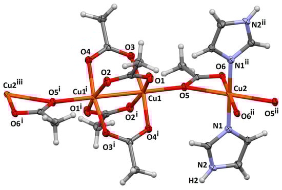 One subunit of the infinite chain for 1, represented with 50% displacement ellipsoids. Symmetry codes: (i) 1−x, 1−y, 1−z; (ii) 2−x, 1−y, 1−z; (iii) x−1, y, z.