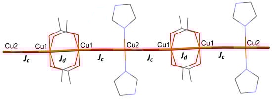 The crystal structure indicates that 1 is a rare example of an ABBABB one-dimensional chain (Figure 6), which could be treated with two exchange values; Jd (exchange between the two copper(II) centers in the dimer; pathway A) and Jc (exchange between the dimer units and the monomer unit; pathway B.)