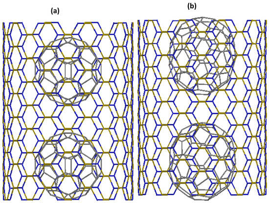 SWBNNTs are obtained by rolling a single hexagonal boron nitride sheet [29,30] and can be specified by integers (n, m) which define the translation vector between two equivalent points. A BN peapod consists of fullerene molecules trapped inside a SWBNNT host. Depending on the nanotube diameter, different configurations of and can certainly exist. Here, we restrict our study by considering only a linear chain of and confined inside SWBNNT. Considering a (10,10) SWBNNT, Figure 1 shows the structures of the encapsulated C and C. The configuration of the guest and molecules inside SWBNNTs is derived from total energy minimizations according to the procedure described in our previous works on carbon peapods [23].