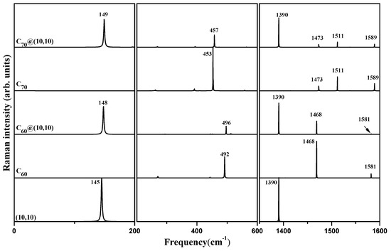 - Fergani, F.; Chadli, H.; Belhboub, A.; Hermet, P.; Rahmani, A. Theoretical Study of the Raman Spectra of C70 Fullerene Carbon Peapods. J. Phys. Chem. C 2015, 119, 5679–5686. [Google Scholar] [CrossRef]
