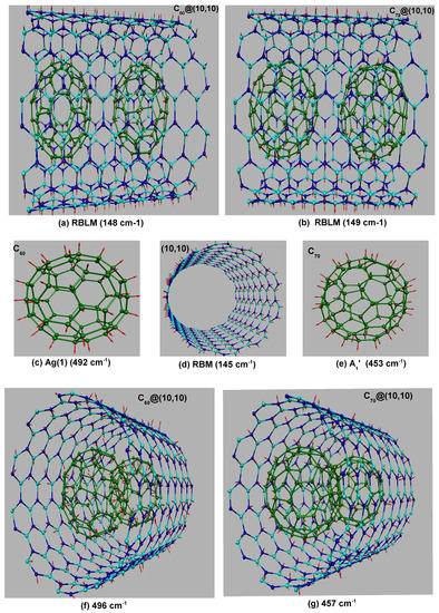 The main modes of the (10,10) SWBNNT, and the and molecules, are almost not affected by the encapsulation in the TLM region. Indeed, in this region, the position and the relative intensity of the Raman lines observed in peapods is a supperposition of the Raman lines of each of the sub-systems. For the BLM region, an upshift of the RBM of the tube is observed when the and molecules are encapsulated into the tube. For instance, the RBM of the unfilled (10,10) SWBNNT shifts from 145 cm in empty (10,10) to 148 and 149 cm in completely filled @(10,10) and @(10,10), respectively. In the two kinds of peapods, these modes are assigned to the radial breathing like mode (RBLM) of the tube where all atoms in the tube and in the surface of fullerene adjacent to the tube move in phase along the radial direction (see Figure 3a,b). In contrast, the atoms in adjacent surfaces of fullerenes move in counter-phase along the axial direction. In the intermediate range between 200 and 600 cm, only phonon modes of the and molecules can be observed. The line centered at 492 cm and assigned as the symmetric mode of shifts to 496 cm in @(10,10) peapod. Similarly, the line centered at 453 cm in and assigned as the symmetric mode shifts to 457 cm with the encapsulation. These calculated upshifts can be explained by the van der Waal intermolecular interactions acting between the fullerenes and the SWBNNTs. Concerning the atomic motions modified by the encapsulation, we displayed in Figure 3, the eigendisplacement vectors of these two Raman modes obtained in peapods (Figure 3f,g) from the direct diagonalization of the dynamical matrix, together with the RBM of the unfilled (10,10) SWBNNTs (Figure 3d) and the pure (Figure 3c) and (Figure 3e) molecules. We observe in peapods, a counter-phase coupled motion of the breathing modes of the encapsulated molecule and the tube, and all atoms of the and C molecules vibrate in-phase in the radial direction (see Figure 3f,g).