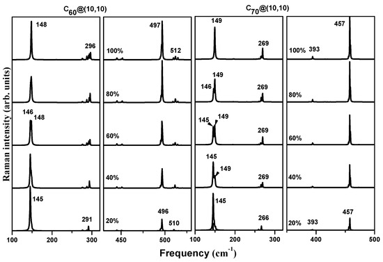 ZZ-polarized Raman spectra in RBLM regions for infinite nanopeapods as a function of their filling rate: C@(10,10) (left) and C@(10,10) (right).