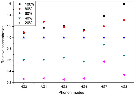First, we calculate the Raman spectrum at different filling factors and for each filling factor. Then, for each filling factor, the integrated intensity ratios between Raman mode of molecules and the RBLM (for C phonon modes: Hg(2), Ag(1), Hg(3) and Hg(4)) or G-mode (for phonon modes: Hg(7) and Ag(2)) are calculated. These calculated intensity ratios are normalized with respect to the same intensity ratios calculated for the 60% filling factor sample. The obtained relative concentrations derived by this way in the case @(10,10) are shown in Figure 6. As expected, the relative concentrations calculated for each mode are close especially for low frequency modes expect the Hg(7) and Ag(2) high frequency modes that could showing a overestimated concentration.